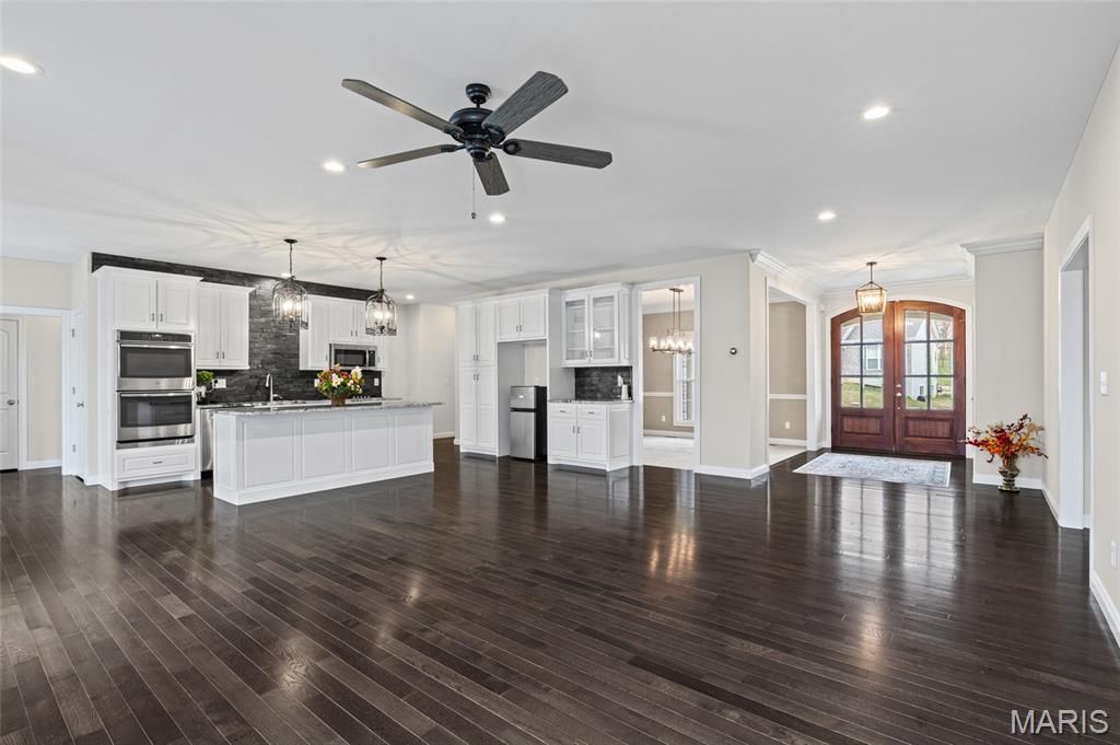 Open floor plan featuring 9-ft ceilings, crown molding, and a spacious great room with marble gas fireplace. The upgraded white kitchen includes stainless appliances, double oven, and gas cooktop, opening to a breakfast area with access to a large maintenance-free deck. Main-floor laundry with built-ins adds convenience. The 9-ft pour walkout basement offers excellent potential for additional living space and opens to a large, flat backyard perfect for a future pool. Maintenance-free exterior with brick front, Permacast pillars, expanded front porch, and 3-car garage. Built by premier builder E&M Development Co., known for upscale communities throughout St. Louis/Jefferson County.